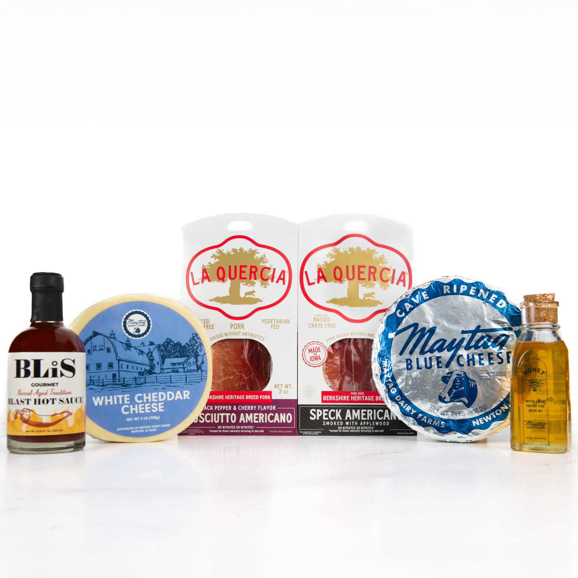 Maytag Honey and fruit preserves work wonderfully to bring a natural sweetness that balances the saltiness of cheeses and meats, especially when drizzled over blue cheese. Dark chocolate or Marcona almonds are an unexpected but delightful addition, adding richness and a bit of crunch to round out the flavors on the board.