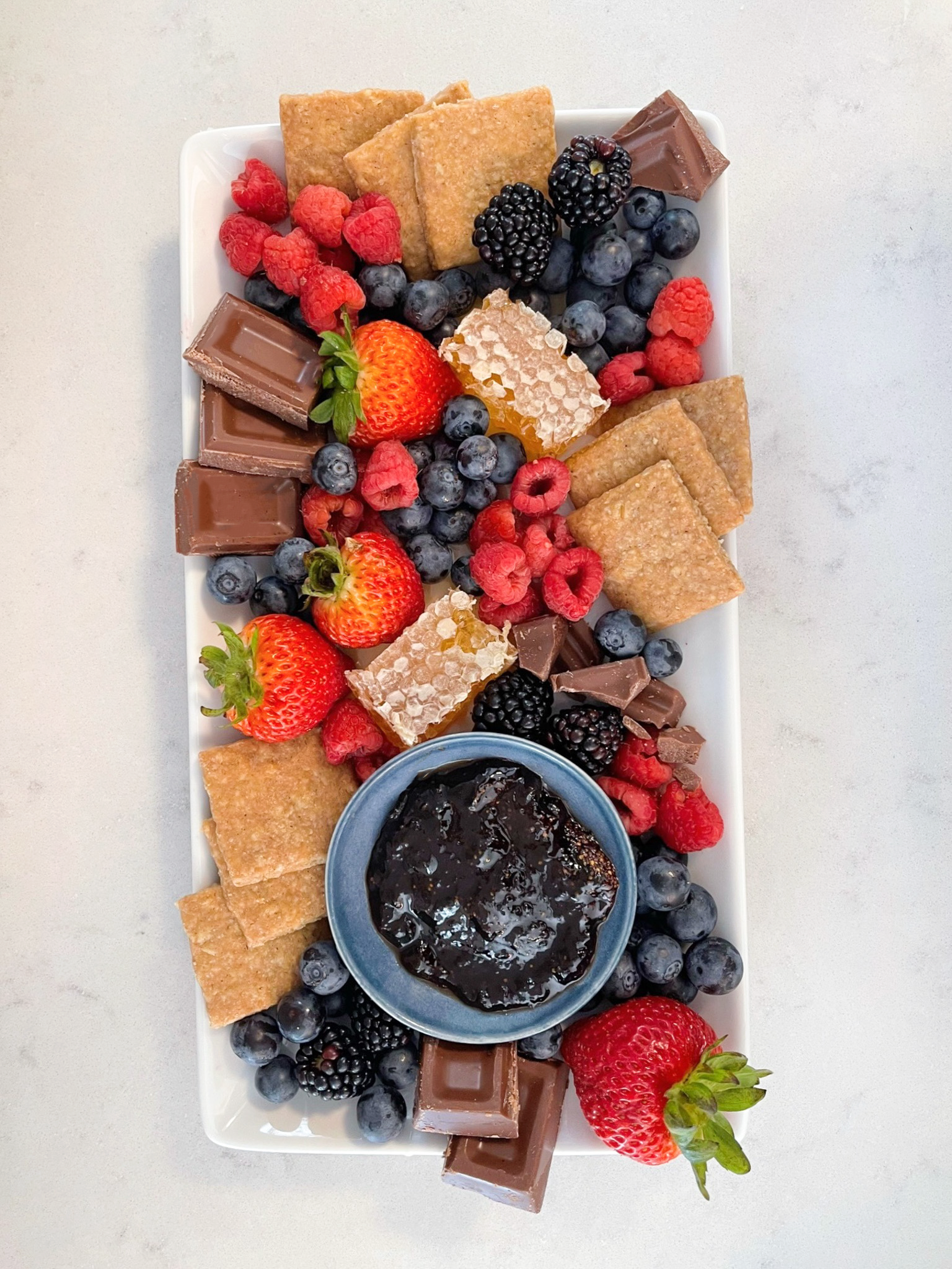 Maytag Honey and fruit preserves work wonderfully to bring a natural sweetness that balances the saltiness of cheeses and meats, especially when drizzled over blue cheese. Dark chocolate or Marcona almonds are an unexpected but delightful addition, adding richness and a bit of crunch to round out the flavors on the board.