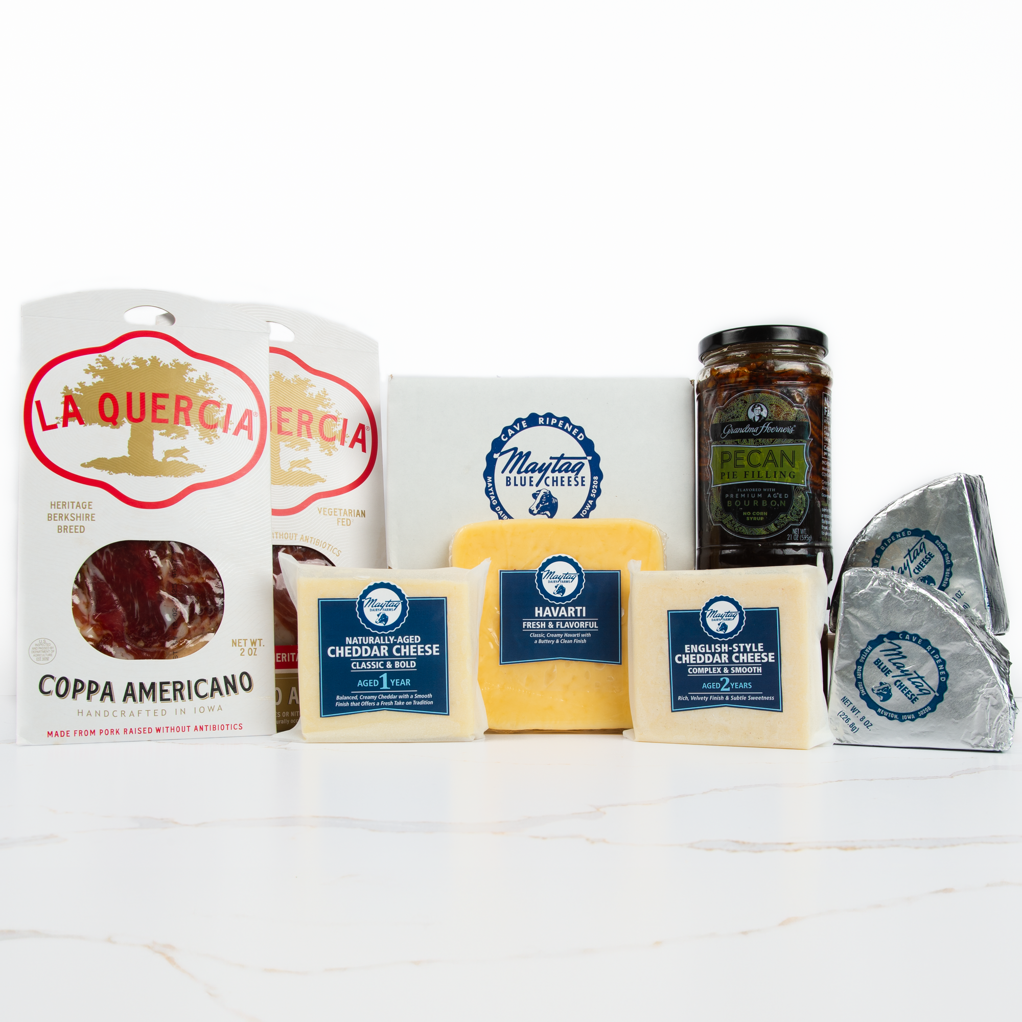 Antipasti selections of pickled vegetables and olives bring vibrant flavors and textures that beautifully enhance a charcuterie spread featuring Maytag Dairy Farms cheeses and La Quercia meats. The tangy acidity of pickled vegetables like roasted red peppers, and briny olives provides a bright contrast to rich and creamy prosciutto, cutting through the fat and highlighting their nuanced flavors. Similarly, pickled vegetables add a refreshing balance to Maytag Dairy Farms’ blue cheese and other creamy cheeses, creating a harmonious blend of sharp, tangy, and savory notes. With their vibrant, palate-cleansing qualities, antipasti items are the perfect complement to elevate and diversify any cheese and charcuterie board.